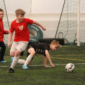 Harrastejalpalloturnaus. Nuori poika on potkaisemassa ilmassa olevaa palloa, volleytä.