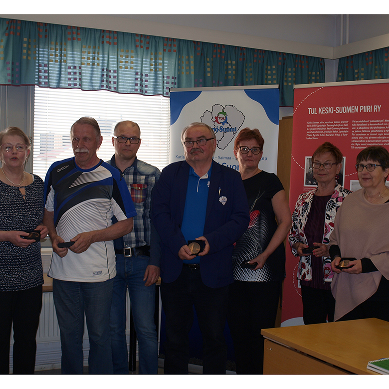 TUL:n satavuotisjuhlamitalin kokouksessa vastaanottivat piirin kunniapuheenjohtaja Heikki Mäkinen, jyväskyläläiset Petri Hagman, Leena Yksjärvi, Hilkka Kaipainen, Mirja Huovinen ja laukaalainen Helka Maltolahti sekä Hannu Kiminkinen.
