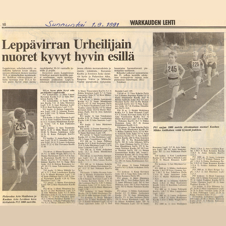 – Toivottavasti lasten vanhemmat tarttuisivat myös mitan päähän, niin saataisiin kisat vietyä kunnialla läpi. Leppävirran Urheilijoille kisat ovat melkoinen ponnistus, mutta toivottavasti tulevinakin vuosina nähtäisiin Leppävirralla lasten yleisurheilua, jossa olisi osallistujia ympäri Suomea, toivoo noidenkin kisojen alkutyöntekijä Jorma Rajakannas.
