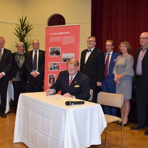 Kuva: Jarkko Mänttäri. Kuvassa TUL:n Keski-Suomen piirin kunniapuheenjohtaja Heikki Mäkinen varmentamassa perustajaseurojen edustajien allekirjoittamaa jatkosopimusta.