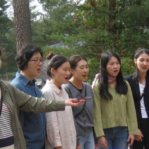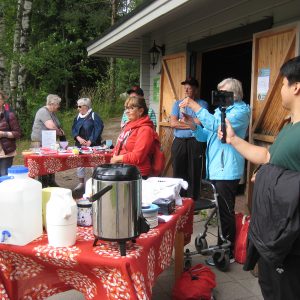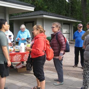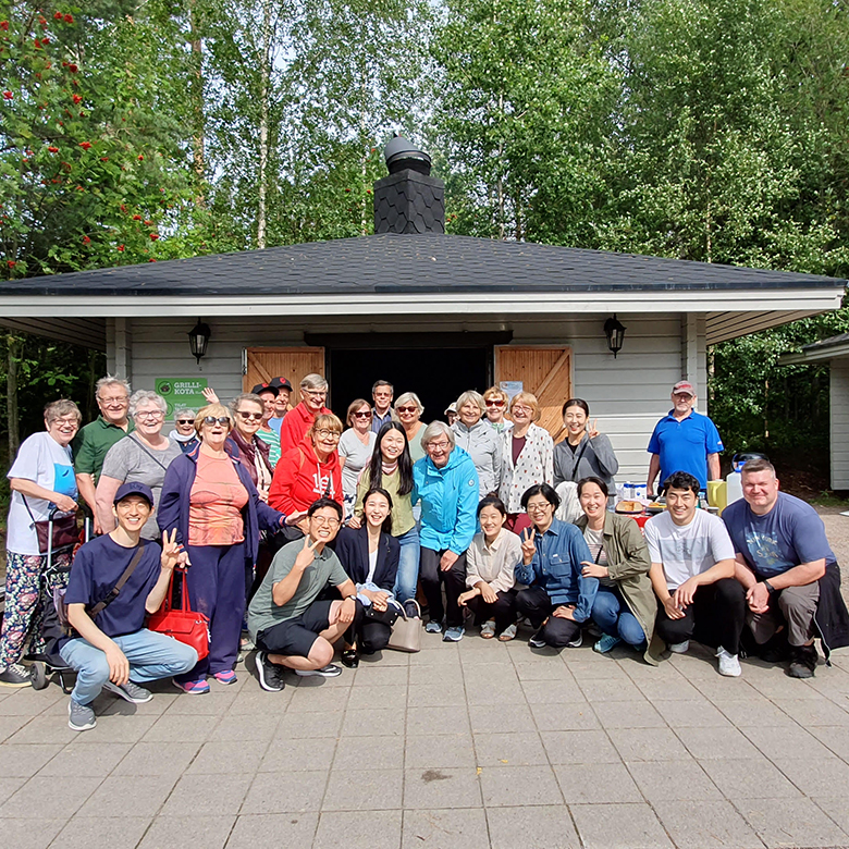 Ja kesken kaiken paikalle tulla tupsahti pari korealaista nuorta ja heidän oppaansa. He kysyivät, että mikä tapahtuma meillä oli ja tietenkin me kerroimme. Ja tovin kuluttua nuoria korealaisia oli paljon enemmän. He olivat kuoron jäseniä, The Vine Tree Choir, jotka olivat tulleet esiintymään Lahteen. Osa kuoron jäsenistä oli vielä matkalla, jonka vuoksi muilla oli vapaata aikaa. Kuusijärvi oli valikoitunut kohteeksi ihan sattumalta. Kahvipisteemme sai erikoista huomiota, koska myynnissä oli kotitekoisia leivonnaisia, jotka maistuivat yllätysvieraillemme. Grillimakkaraa kukaan korealaisista ei uskaltanut maistaa. Ja kuten nykyään kuuluu, niin meistäkin otettiin yhteiskuva, josta näkyy reipas, iloinen tunnelma.