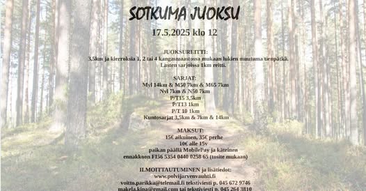 Aika ja paikka: ma 5.5.2025 Leppävirta Avoimet TUL Järvi-Suomen maastojuoksut. Sarjoja ja matkoja kaikenikäisille 100 m- 3 km. Myös maastokävelysarjat. Lisätietoja: Leppävirran Urheilijat, Jorma Rajakannas, jr.lepu@gmail.com tai 040 5287131...