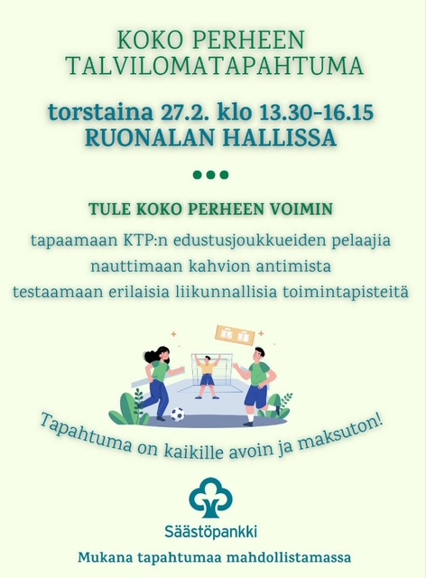 Matalan kynnyksen liikuntatapahtuma, eri liikuntapisteiden kokeilua, KTP:n mies- ja naispelaajien vierailuja.