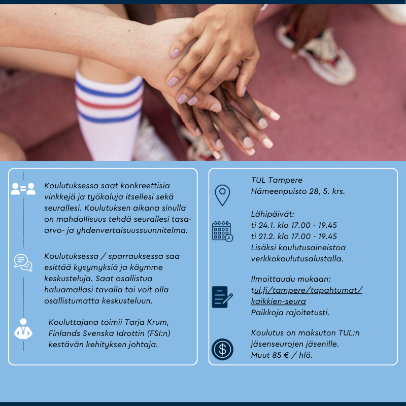 Tervetuloa tasa-arvo- ja yhdenvertaisuuskoulutukseen! Koulutukseen osallistuminen ei vaadi ennakkotietoa aihealueesta. Koulutuksessa käsitellään seuratoiminnassa esiin nousevia tasa-arvo- ja yhdenvertaisuusasioita. Koulutuksen aikana pystyt tekemään seurallesi tasa-arvo- ja yhdenvertaisuussuunnitelman. Itse asiassa me kutsumme tätä mieluusti sparraukseksi. Tavoitteena on käydä sisältöä läpi keskustellen, kuulet esimerkkejä toisista seuroista ja saat konkreettisia vinkkejä omaan ja seurasi toimintaan.