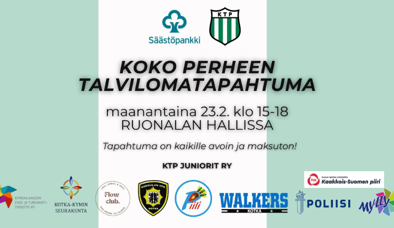 Talvilomatapahtuma tarjoaa matalan kynnyksen mahdollisuuden tulla liikkumaan, kohtaamaan ja viettämään yhteistä aikaa. Tapahtumassa perheet pääsevät tutustumaan hälytysajoneuvoihin, tapaamaan KTP:n edustusjoukkueiden pelaajia, kokeilemaan erilaisia toimintapisteitä sekä nauttimaan pienen kahvion tarjonnasta.