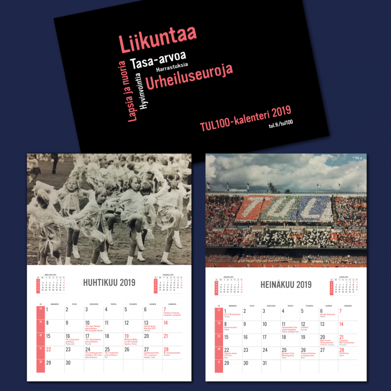 Kokosimme osan TUL100-juhlavuoden tapahtumista painettuun seinäkalenteriin 2019. Kalenterissa on tapahtumia koko Suomen alueelta sekä kuvia TUL:n 100-vuotisen historian eri vaiheista. Kaikki TUL100-tapahtumat löytyvät TUL:n verkkosivujen tapahtumakalenterista tammikuussa 2019.
