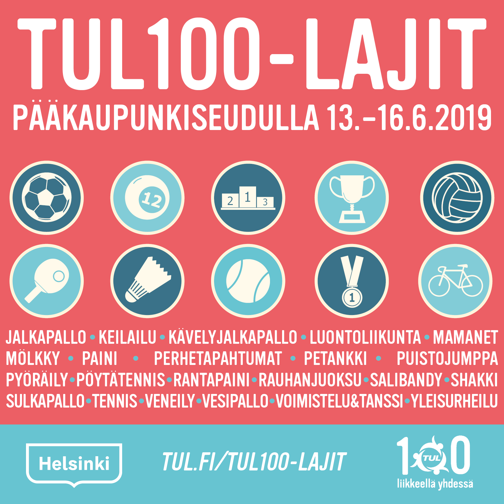 TUL100-tapahtumaviikonlopun aikana 13.–16.6.2019 TUL-seurojen lajit saavat laajasti näkyvyyttä. Lajikirjo koostuu avoimista mestaruuskilpailuista, turnauksista, näytöksistä, lajikokeiluista ja monista muista kaikenikäisille osallistujille ja katsojille sopivista tapahtumista. Suuri osa tapahtumista on kaikille avoimia ja maksuttomia.