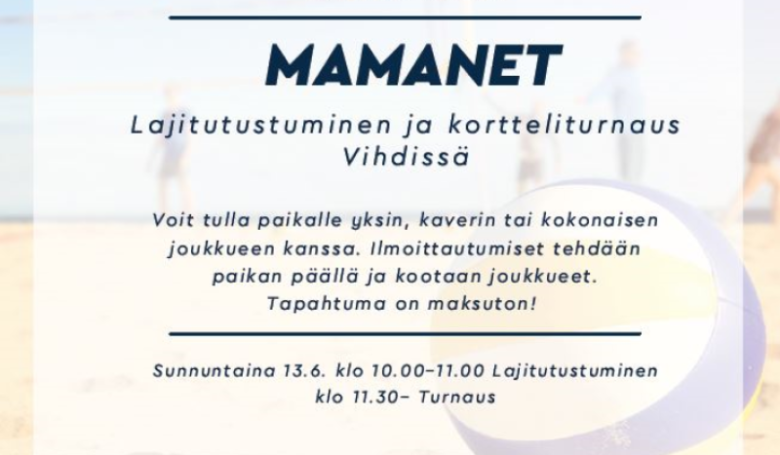Osallistu Mamet:in lajikokeiluun ja turnaukseen. Tapahtuma on ilmainen ja ilmoittautumiset tehdään paikan päällä.